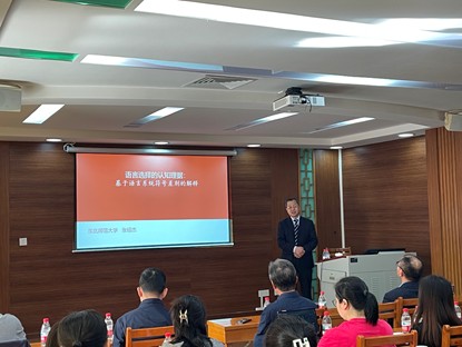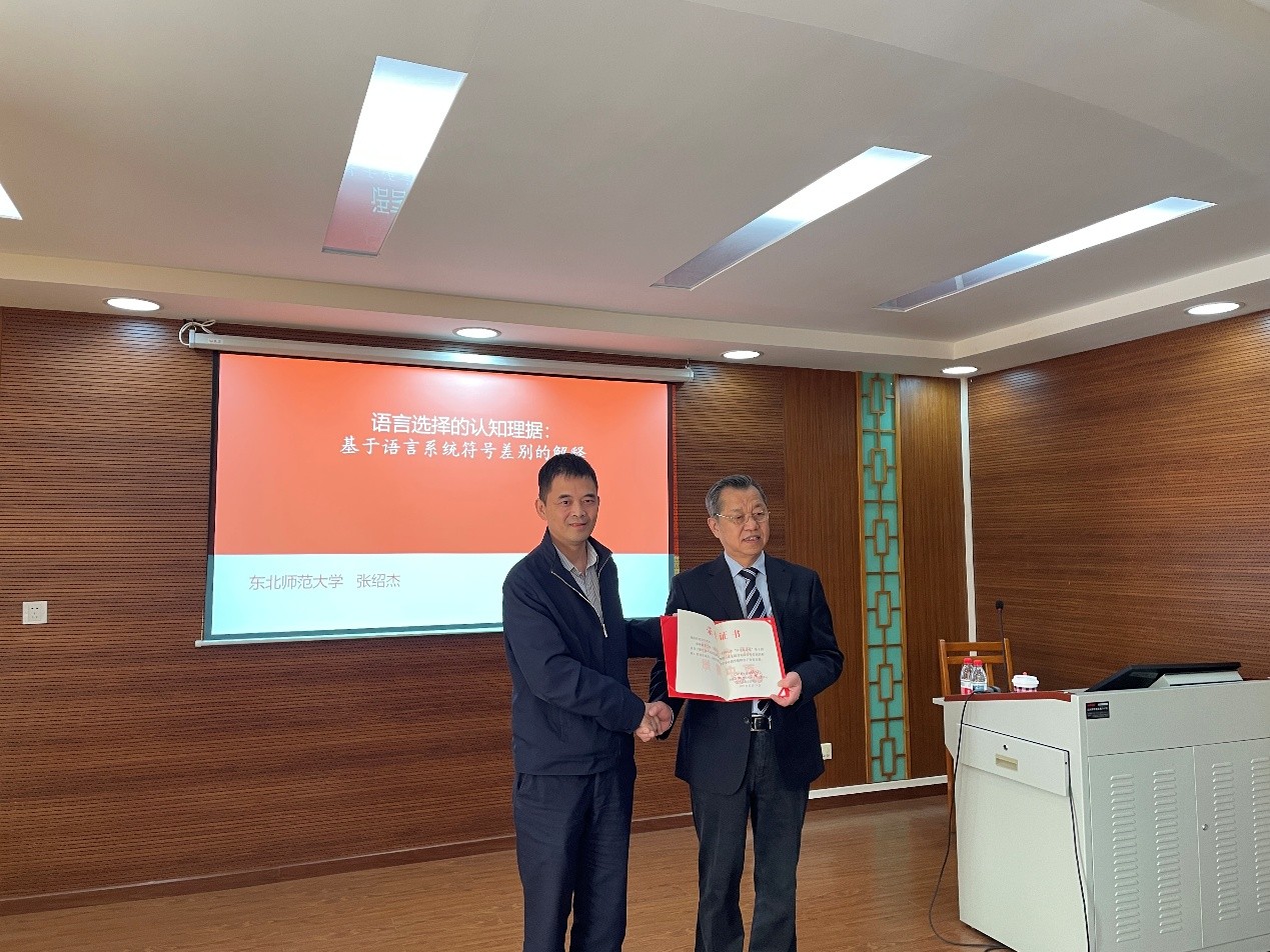 2025年12月24日上午,“桂诗春讲堂”系列讲座第十四讲在白云山校区第八教学楼306室举行。本期讲堂特别邀请了东北师范大学二级教授、博士生导师、原副校长张绍杰担任主讲,讲题为“语言选择的认知理据:基于语言系统符号差别的解释”。讲座由《现代外语》主编冉永平教授主持,徐海教授、魏在江教授、袁传有教授、戴光荣教授、李成团教授、赵林森副教授、雷容副教授,以及来自各学院(研究中心)的师生参加了本次讲座。在讲座开始前,中心副主任徐海教授代表中心为张绍杰教授颁发主讲证书,并合影留念,为本次学术交流拉开序幕。