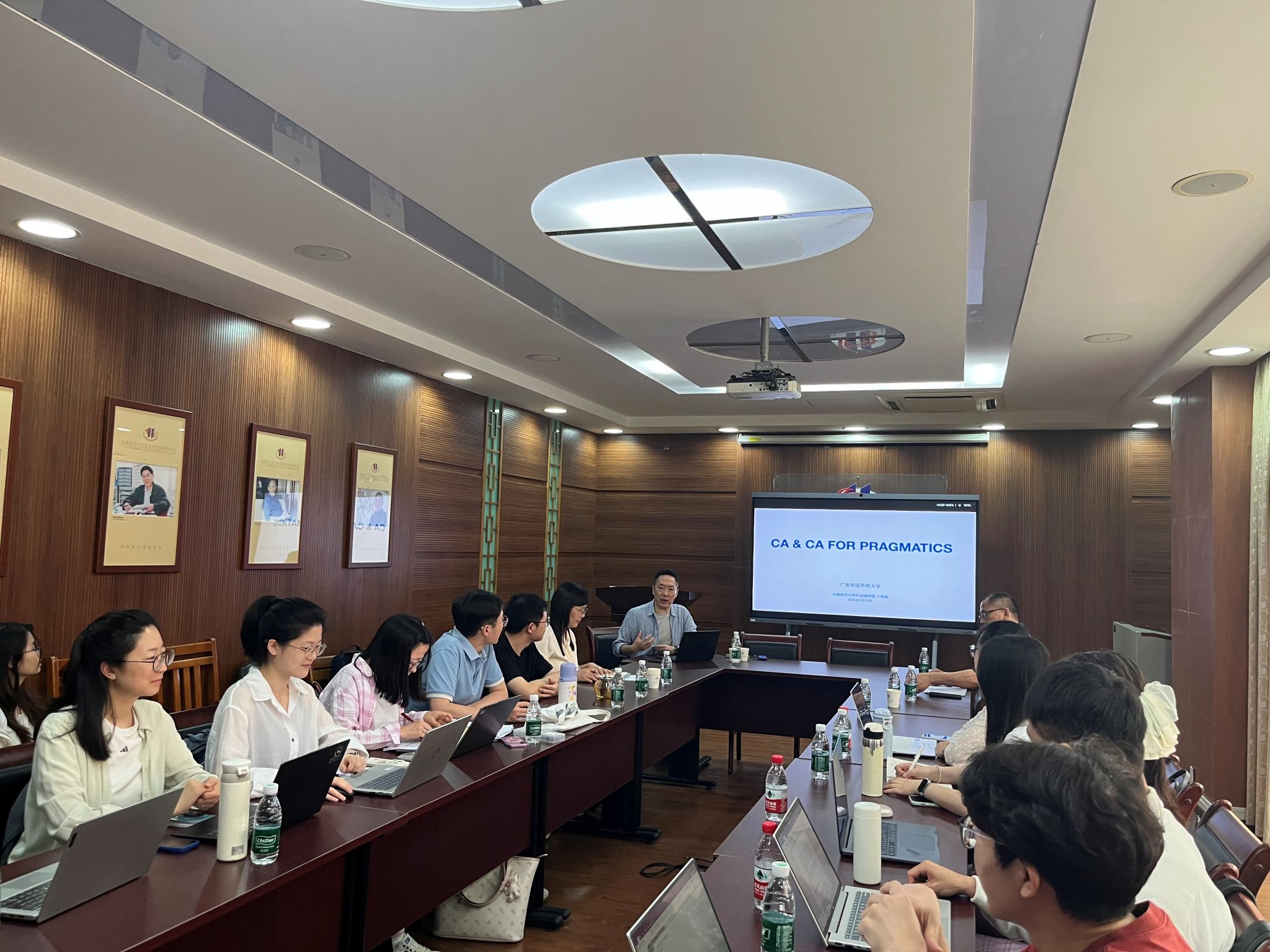 2026年4月10日上午,中国海洋大学于国栋教授应我中心邀请,作题为“CA & CA for Pragmatics(会话分析及用于语用学的会话分析)”的学术讲座。此次学术活动由雷容副教授主持,冉永平教授、赵林森副教授、黄旭副教授等,以及外国语言学及应用语言学方向的博硕士研究生参加了讲座。
