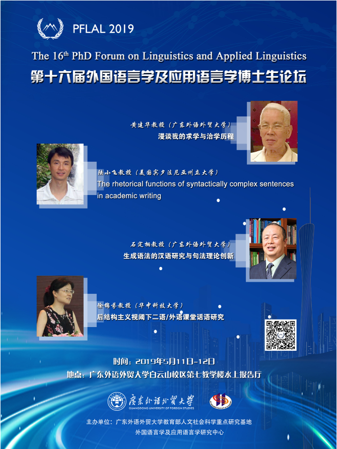 “第十六届外国语言学及应用语言学博士生论坛”计划于2019年5月11日-12日(周六和周日)在广东外语外贸大学北校区召开。本次论坛邀请了语言学及应用语言学相关领域的国内外知名学者作大会主旨发言,并组织博士生进行小组讨论,由相关领域的专家老师进行点评。欢迎相关学科的在读博士研究生积极参与,踊跃投稿!