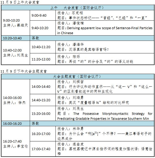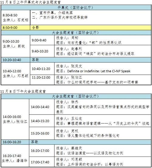 “第七届现代汉语句法语义前沿研讨会”将于2019年11月8-10日在广东外语外贸大学国际会议厅举行。本次研讨会将邀请来自中国社会科学院、北京大学、香港中文大学、台湾清华大学、广东外语外贸大学、澳门大学、香港城市大学、台湾交通大学、台湾中研院、中山大学及暨南大学的海内外汉语句法学和语义学领域的专家学者齐聚广州,探讨现代汉语句法语义研究的前沿问题,分享最新的研究成果。现将相关会议日程公布如下,欢迎对相关课题感兴趣的师生前来听会并参与讨论。