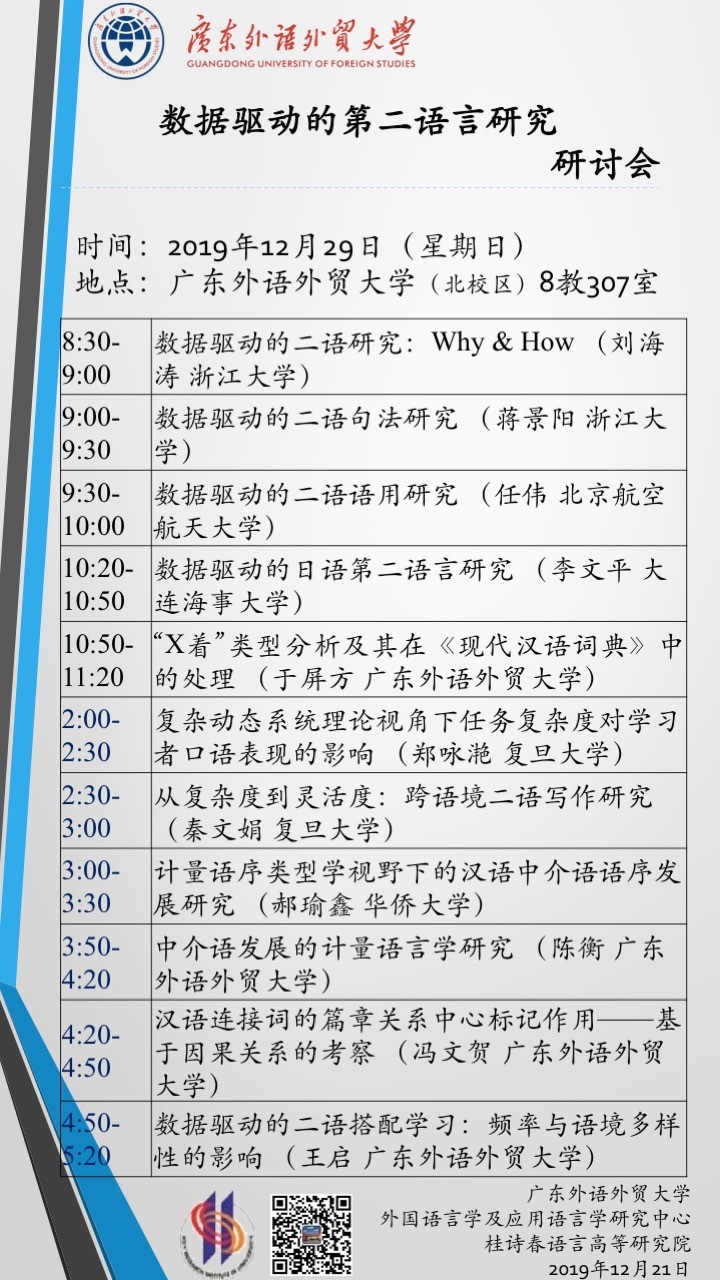 “数据驱动的第二语言研究”研讨会将于2019年12月29日在广东外语外贸大学北校区8教307举行。本次研讨会邀请了来自浙江大学、复旦大学、北京航空航天大学、大连海事大学、华侨大学以及广东外语外贸大学的中青年学者齐聚广州,探讨数据驱动方法的第二语言研究。现将相关会议日程公布如下: