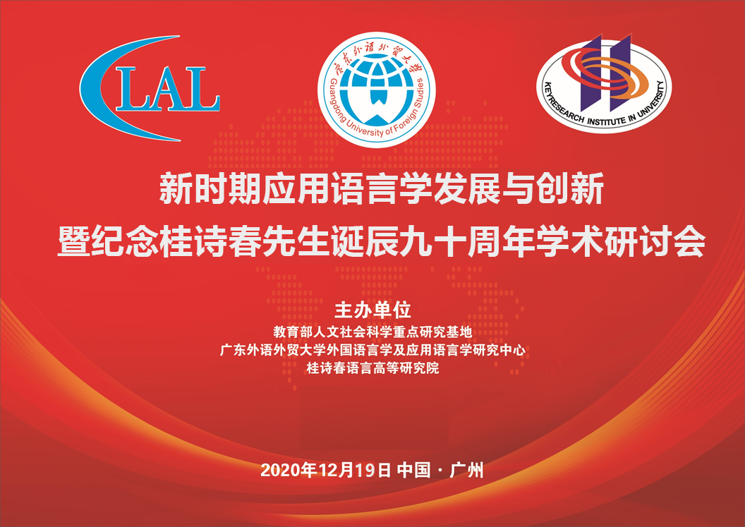 值此广东外语外贸大学建校五十五周年之际,教育部人文社科重点研究基地广东外语外贸大学外国语言学及应用语言学研究中心和桂诗春语言高等研究院于2020年12月19日主办“新时期应用语言学发展与创新暨纪念桂诗春先生诞辰九十周年学术研讨会”,邀请校内外专家学者就新时期应用语言学研究的前沿趋势、理论创新、本土化问题等进行专题发言,纪念桂诗春先生诞辰九十周年,传承学术精神,推动我国应用语言学研究与外语教育事业发展。2020年也是广东外语外贸大学外国语言学及应用语言学研究中心获批成为教育部人文社科重点研究基地二十周年,借此学术研讨之际,探寻新时期背景下我国语言学及应用语言学的发展与创新研究。