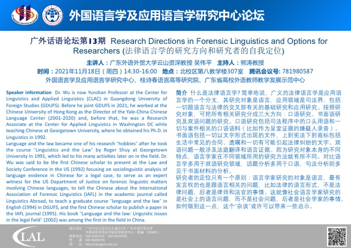 广外话语论坛第13期 Research Directions in Forensic Linguistics and Options for Researchers (法律语言学的研究方向和研究者的自我定位)
