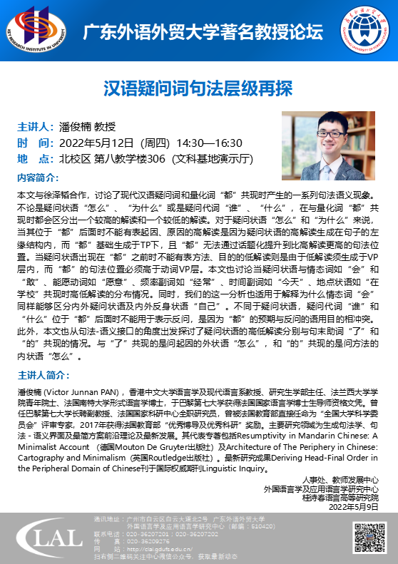 潘俊楠 (Victor Junnan PAN) ,香港中文大学语言学及现代语言系教授、研究生学部主任、法兰西大学学院青年院士、法国南特大学形式语言学博士,于巴黎第七大学获得法国国家语言学博士生导师资格文凭。曾任巴黎第七大学长聘副教授、法国国家科研中心全职研究员,曾被法国教育部直接任命为“全国大学科学委员会”评审专家,2017年获得法国教育部“优秀博导及优秀科研”奖励。主要研究领域为生成句法学、句法-语义界面及最简方案前沿理论及最新发展。其代表专著包括Resumptivity in Mandarin Chinese: A Minimalist Account (德国Mouton De Gruyter出版社)及Architecture of The Periphery in Chinese: Cartography and Minimalism(英国Routledge出版社)。最新研究成果Deriving Head-Final Order in the Peripheral Domain of Chinese刊于国际权威期刊Linguistic Inquiry。