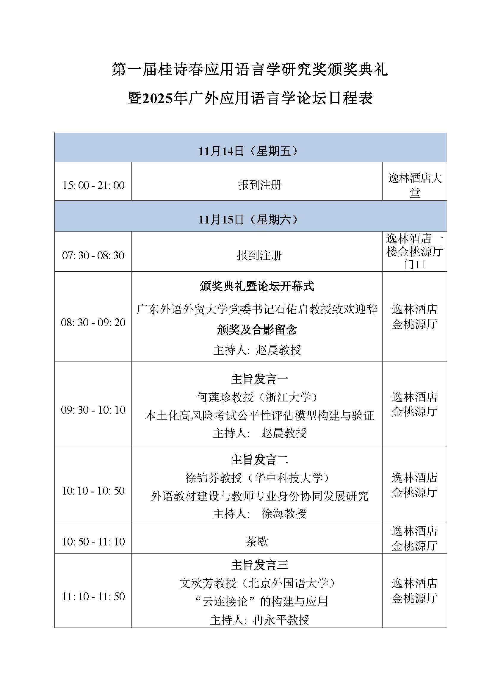 第一届桂诗春应用语言学研究奖颁奖典礼暨2025年广外应用语言学论坛日程表