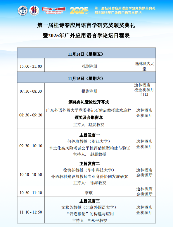 第一届桂诗春应用语言学研究奖颁奖典礼暨2025年广外应用语言学论坛前三场主旨发言将进行全程现场直播,精彩不容错过!