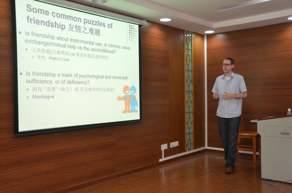 Dr. Lambertstarted the lecture with guiding questions like “What is friendship?” “What is therelationship between friendship and morality?” and reveled that, in seeking theanswers, researchers had found inconsistence or even conflict existing betweenimpartial standpoint and close friendship. To figure out the situation andalleviate the tension between the two, Dr. Lambert turned to Confucian account,the Chinese philosophy, of morality and friendship, which accentuates harmonyand sees it as the moral conduct principle. In line with this, Dr. Lambertargues that activities that seek harmonious state, though sometimes biased,still belong to the category of friendship, a friendship named event friendship.According to Dr. Lambert, emerging from affective experience, the event friendshipis a kind of moral conduct that bases itself in cognitive skills and sees delightas its goal, which provides a new perspective to study friendship, thus alleviatingthe tension existing between the impartial standpoint and the close friendship.
