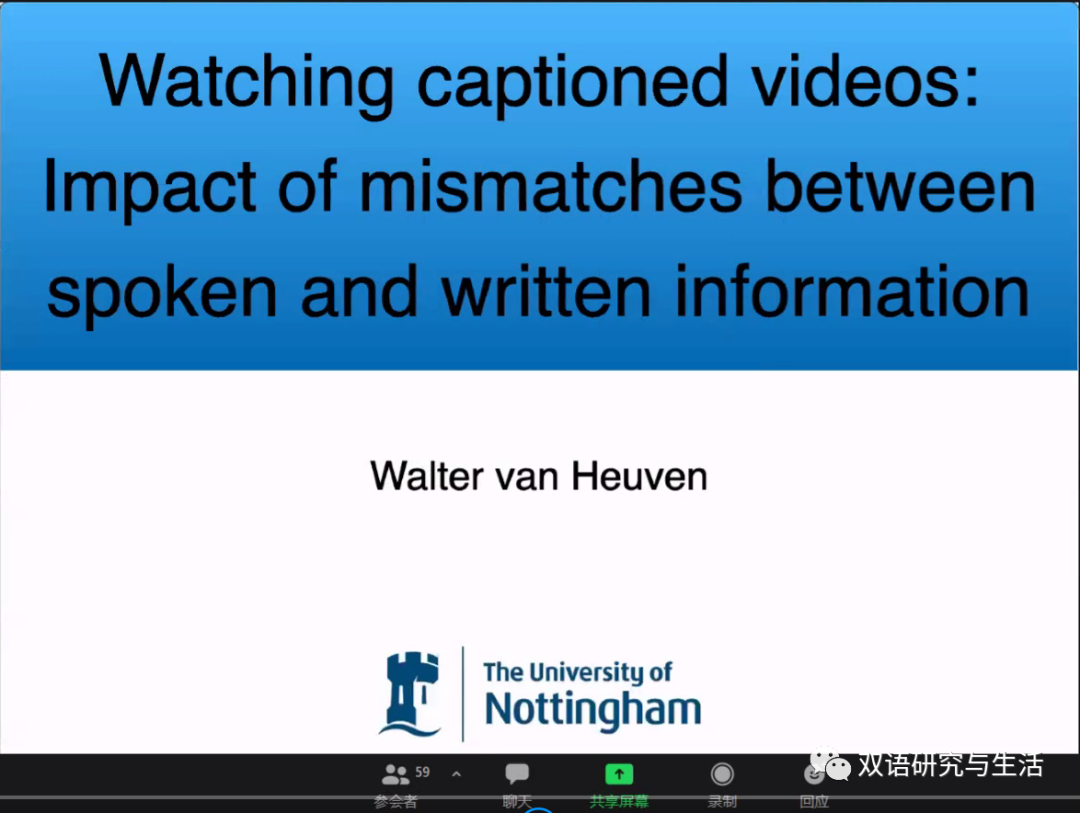 On May 19, 2021, Dr Walter van Heaven from the University of Nottingham was invited by the lab of our centre to give an online talk entitled “Watching captioned videos: Impact of mismatches between spoken and written information”. The talk was given via Zoom, attracting almost 90 participants.